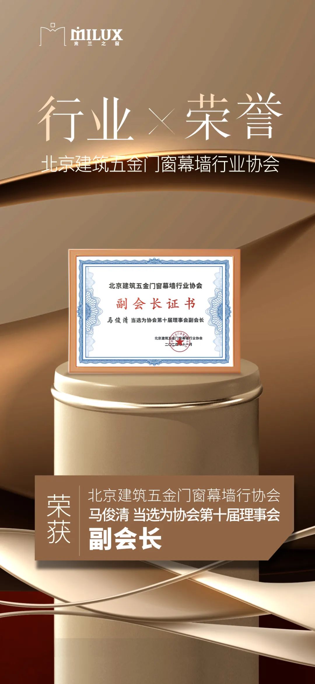 由北京建筑五金門窗幕墻行業(yè)協(xié)會(huì)主辦的第十屆一次會(huì)員大會(huì)暨門窗幕墻行業(yè)發(fā)展趨勢(shì)研討會(huì)近日在北京隆重召開。會(huì)上,米蘭之窗集團(tuán)董事長(zhǎng)馬俊清先生再次當(dāng)選為協(xié)會(huì)副會(huì)長(zhǎng)。此番連任,不僅是對(duì)其在門窗幕墻領(lǐng)域持續(xù)引領(lǐng)創(chuàng)新、積極貢獻(xiàn)和深遠(yuǎn)影響力的崇高肯定,更是對(duì)米蘭之窗在技術(shù)變革、綠色發(fā)展與社會(huì)責(zé)任履行方面行業(yè)標(biāo)桿地位的再次確認(rèn)。此項(xiàng)榮譽(yù)的獲得,充分彰顯了米蘭之窗在推動(dòng)行業(yè)高質(zhì)量發(fā)展進(jìn)程中的關(guān)鍵作用和中堅(jiān)力量。